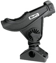 Holds a baitcaster reel in a cushioned cradle. A slot in the front of the rod holder allows for a spinning reel to be securely held in position. Rod holder design has a side mounted flange, which leaves the bottom open, allowing the rod holder to accommodate trigger sticks. Pistol grip rod butts easily clear the sides of the rod holder for quick rod retrieval. Rods can be secured in holder with a soft latching strap which snaps over the top. Fully adjustable up and down and rotates 360°.